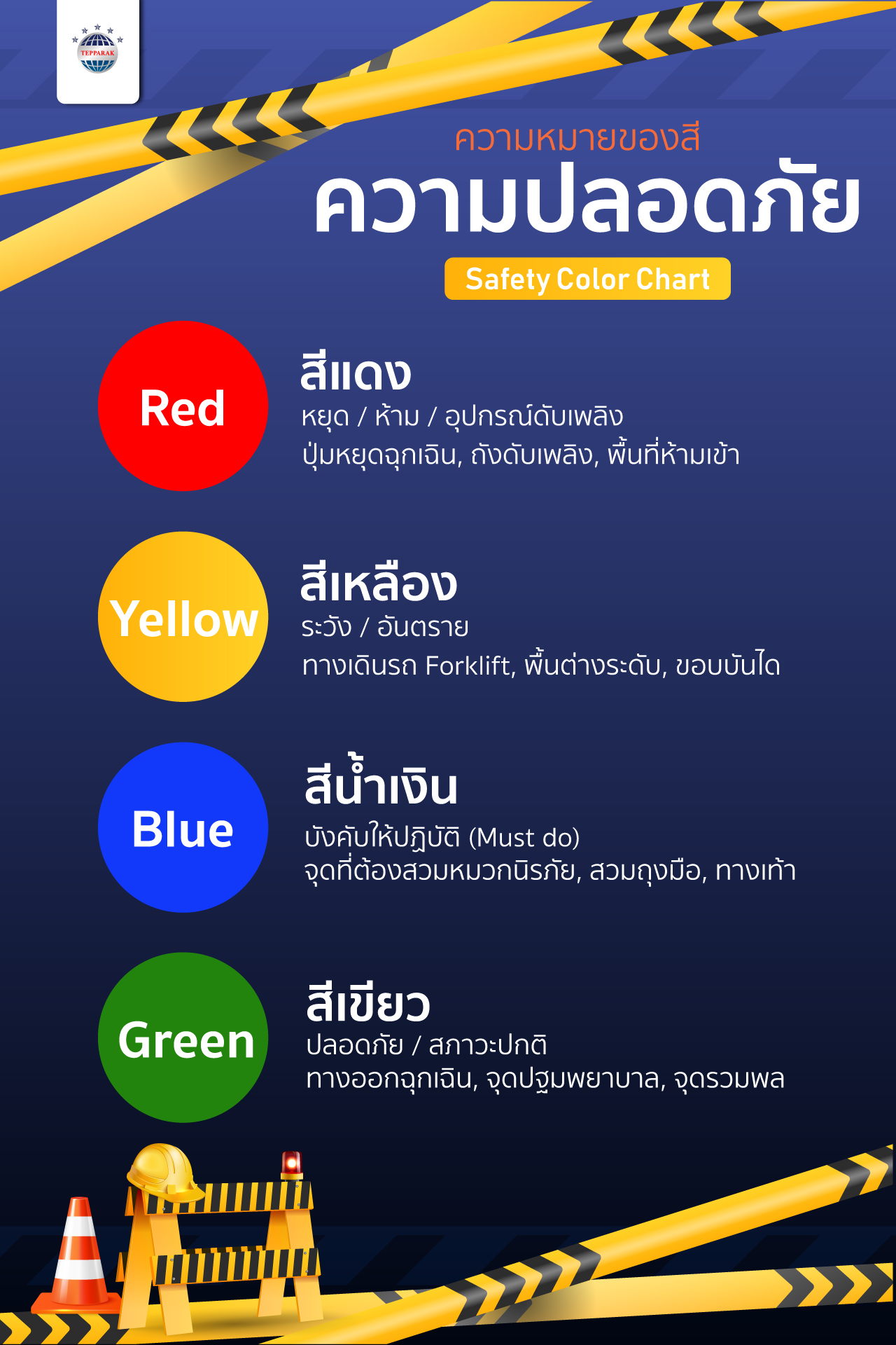 | สีน้ำเงิน (Blue) | บังคับให้ปฏิบัติ (Must do) | จุดที่ต้องสวมหมวกนิรภัย, สวมถุงมือ, สวมรองเท้าเซฟตี้ |