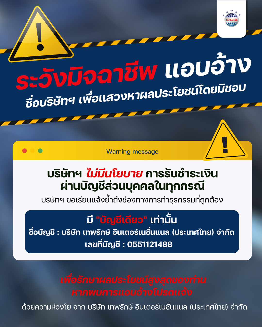 บริษัทไม่มีนโยบายโอนเงินเข้าบัญชีอื่นทุกกรณี